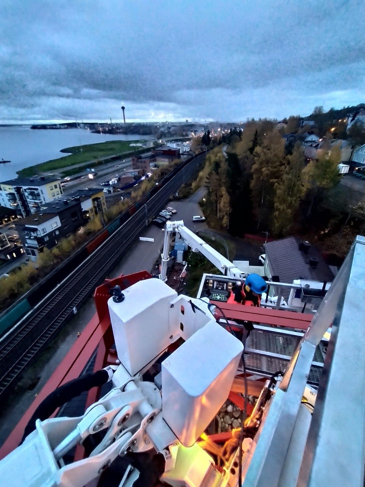 «La zona se encuentra a orillas de un lago donde el viento sopla fuerte, por lo que realmente se requieren Bronto robustas y estables para realizar el trabajo. La rotación de la jaula grande también ha sido muy útil», afirma Vesa Lamminsivu, director general de Lamminsivu.