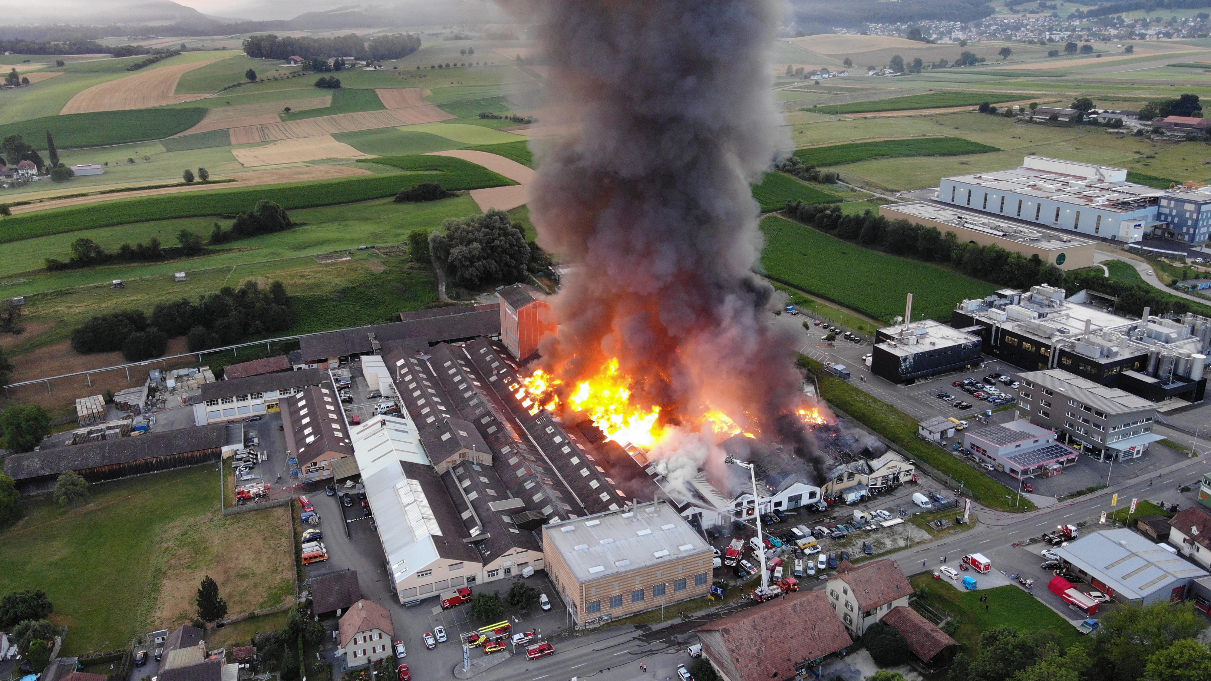 Early on Friday morning 10th of July 2020, a major fire completely destroyed buildings over an area of approximately 20,000 m² in the Laufen industrial and technological park. 220 members from 10 fire departments in the cantons of Basel-Landschaft, Basel-Stadt and Solothurn together with staff from other organisations were involved in the firefighting operation. Firefighting was made more difficult by the fact that the water main available did not provide sufficient water and a further supply of water had to be obtained from the river Birs. No one was injured in the fire or during the work to put it out. The damage nevertheless amounted to well over a million francs.
